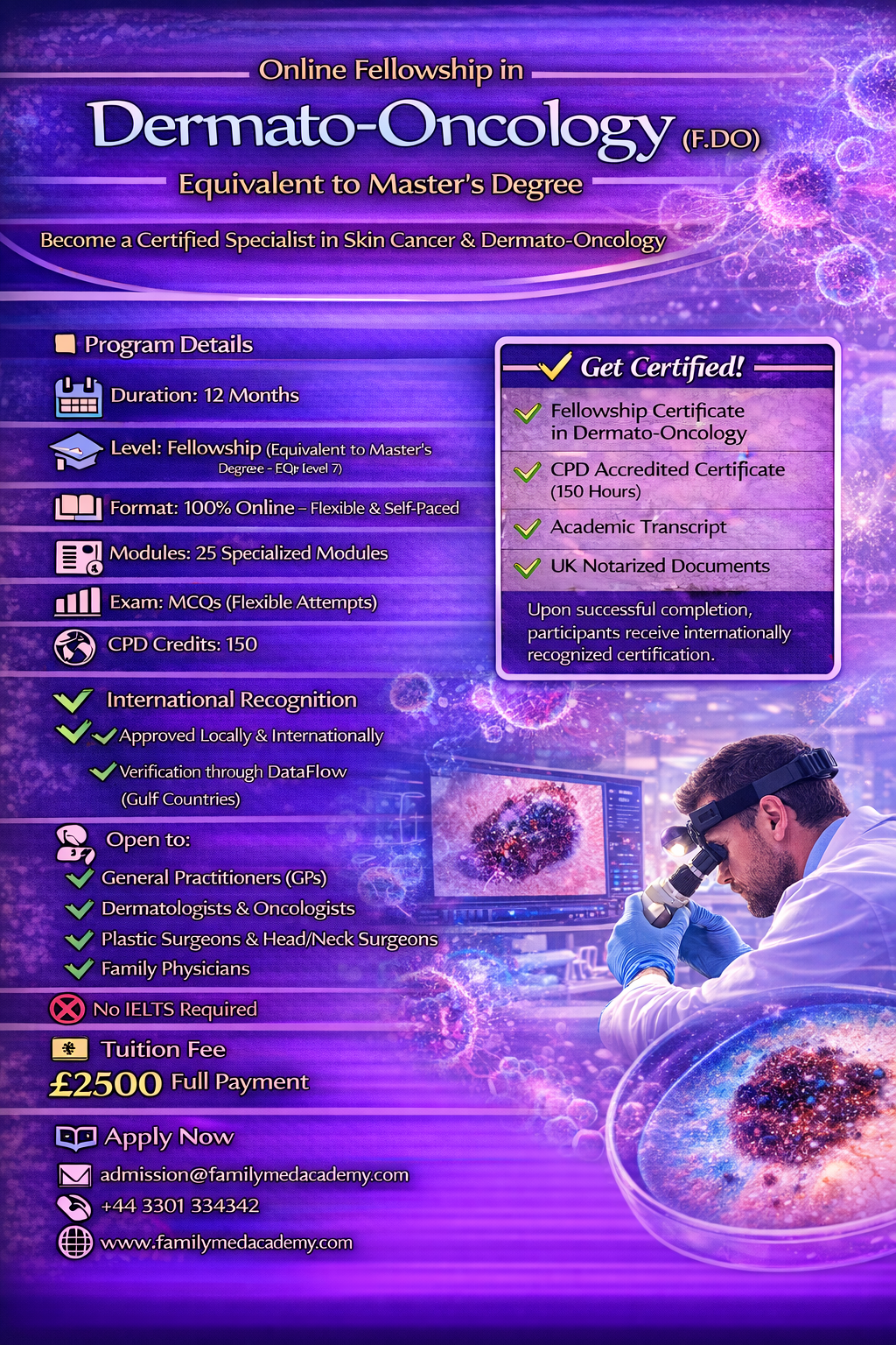 Answer: Yes, upon successful completion of the Fellowship in Dermato-Oncology and passing the exam, you will be recognized as an International Specialist in Dermato-Oncology, certified by the Liverpool Academy for Family Medicine. This certification will enhance your expertise and support your career progression in healthcare roles related to Dermato-Oncology.