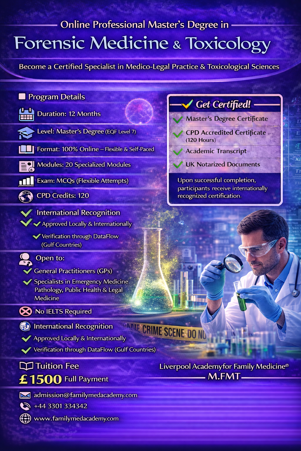 This program at the Liverpool Academy for Family Medicine is open to Open to forensic pathologists, toxicologists, general practitioners, and healthcare professionals - No IELTS requirement is needed