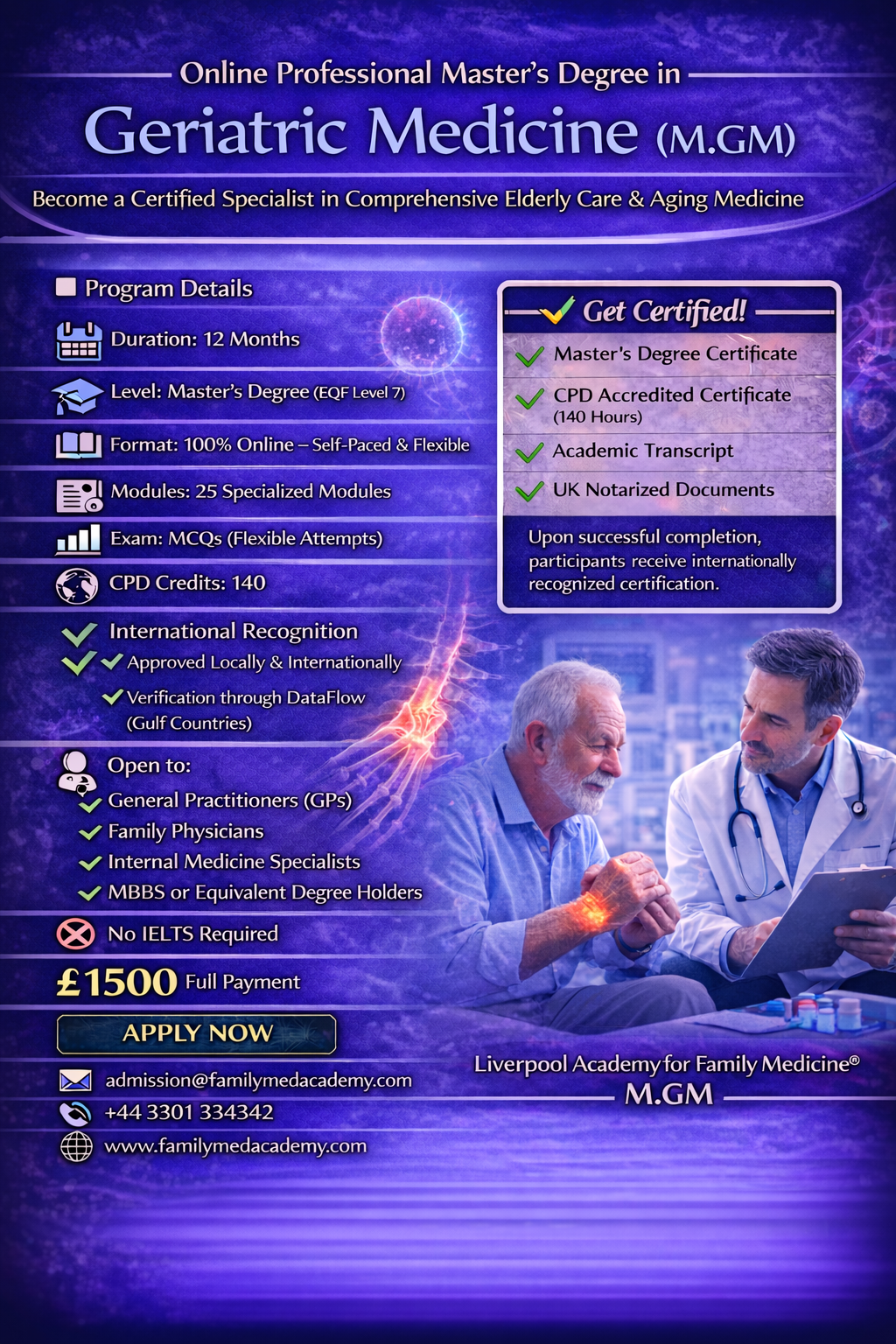 This program at the Liverpool Academy for Family Medicine is open to all doctors holding an MBBS degree and is available to international general practitioners. No IELTS requirement is needed, making it accessible to qualified practitioners globally who wish to enhance their expertise in Geriatric medicine.