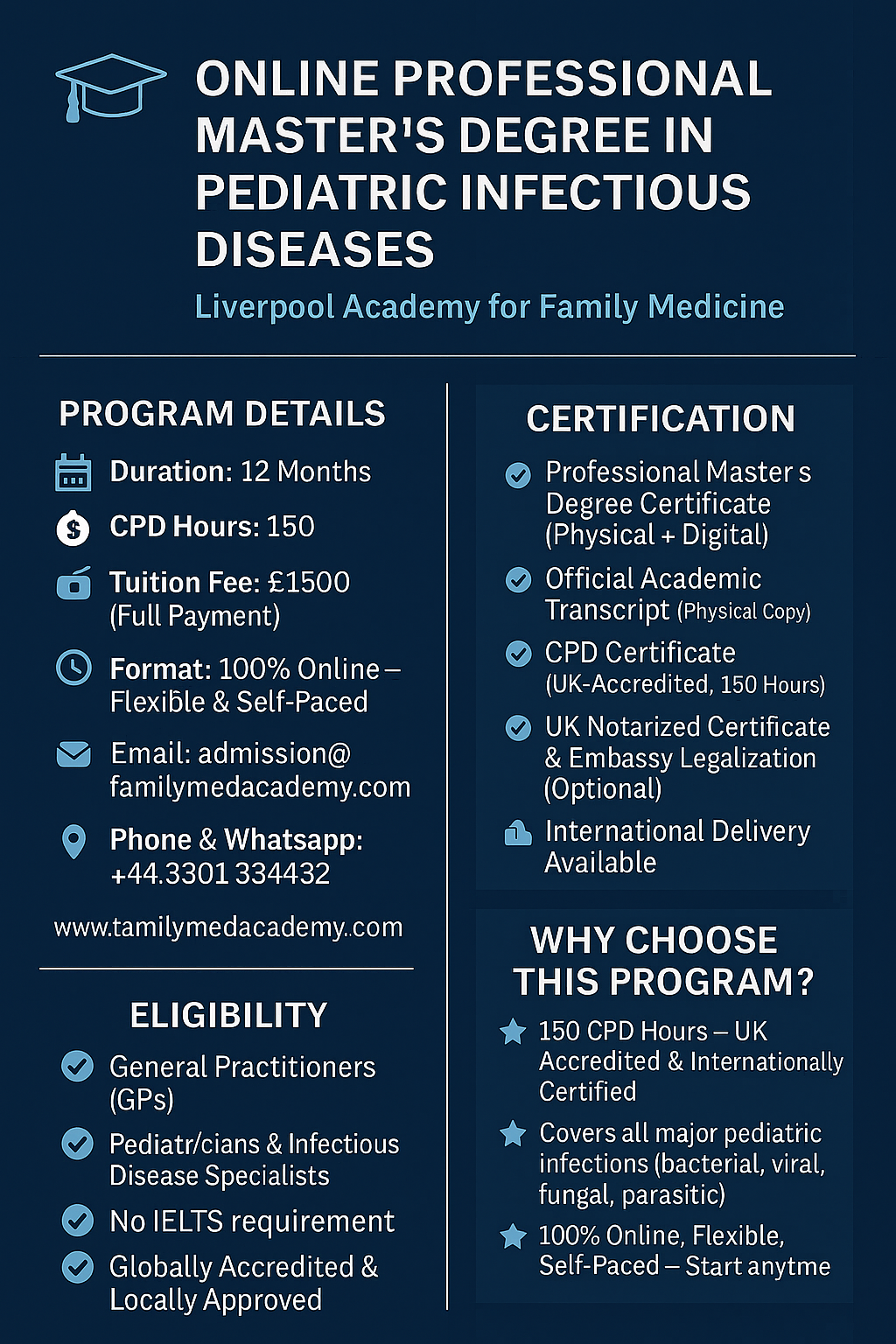 This program at the Liverpool Academy for Family Medicine is open to all doctors holding an MBBS degree and is available to international general practitioners. No IELTS requirement is needed, making it accessible to qualified practitioners globally who wish to enhance their expertise in the field