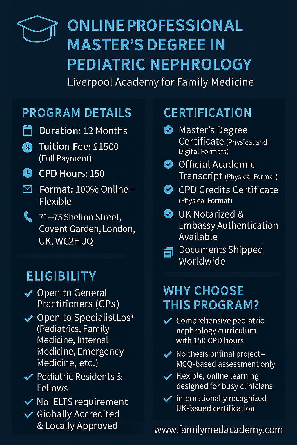 This program at the Liverpool Academy for Family Medicine is open to all doctors holding an MBBS degree and is available to international general practitioners. No IELTS requirement is needed, making it accessible to qualified practitioners globally who wish to enhance their expertise in the field