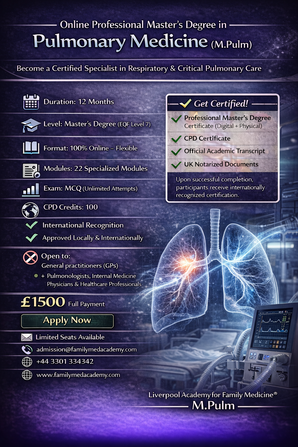 This Professional Master’s Degree offered by the Liverpool Academy for Family Medicine follows the academic structure, learning outcomes, and credit standards used across the European Higher Education Area (EHEA).