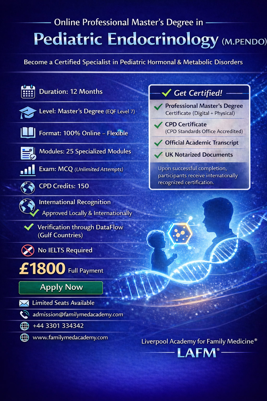 This Professional Master’s Degree offered by the Liverpool Academy for Family Medicine follows the academic structure, learning outcomes, and credit standards used across the European Higher Education Area (EHEA).